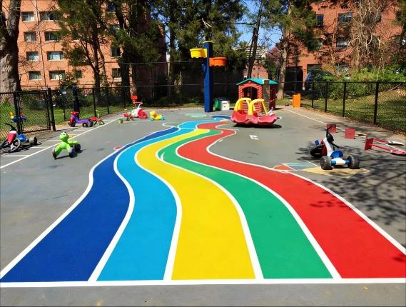 Preformed thermoplastic playground markings resist fading because pigments are embedded within the material.